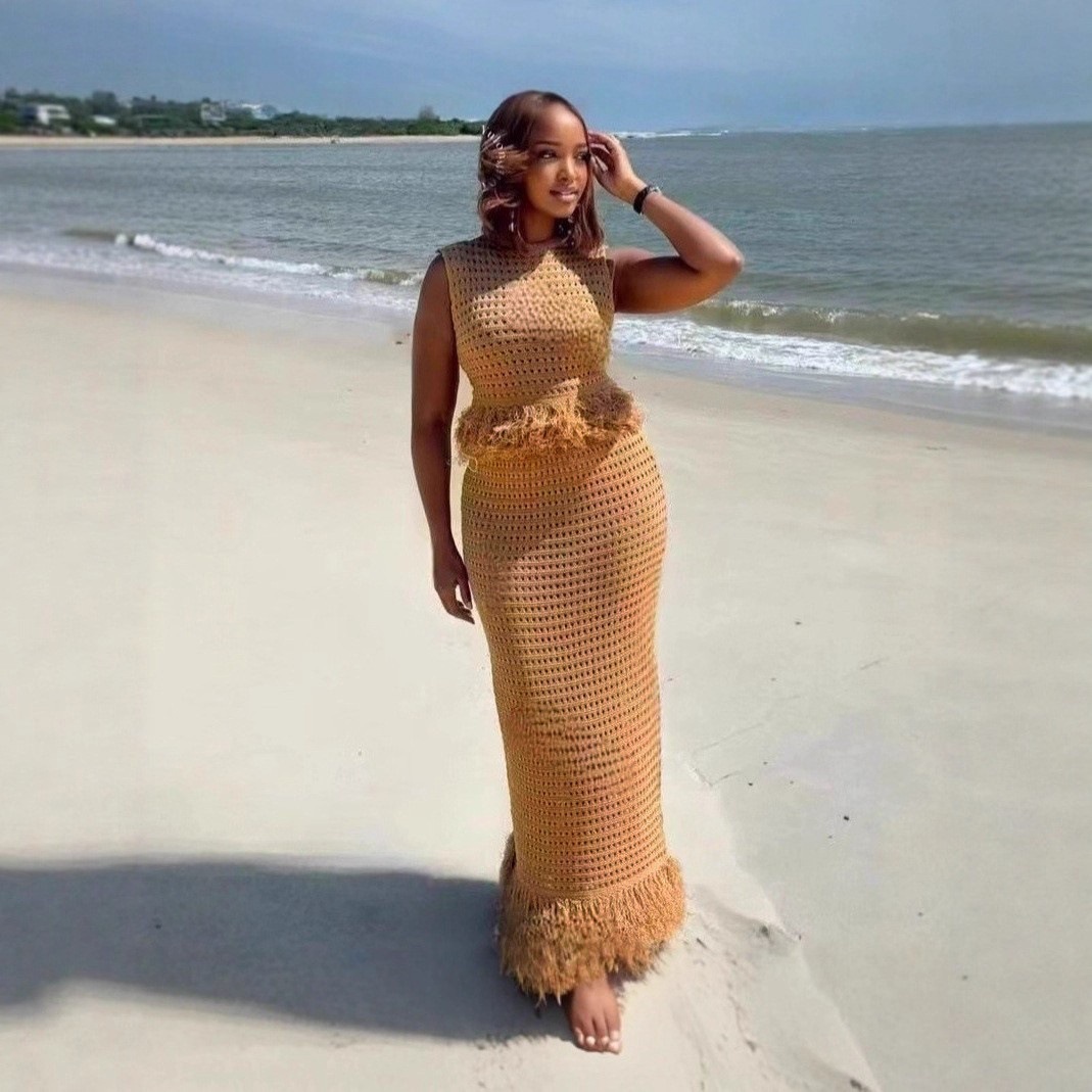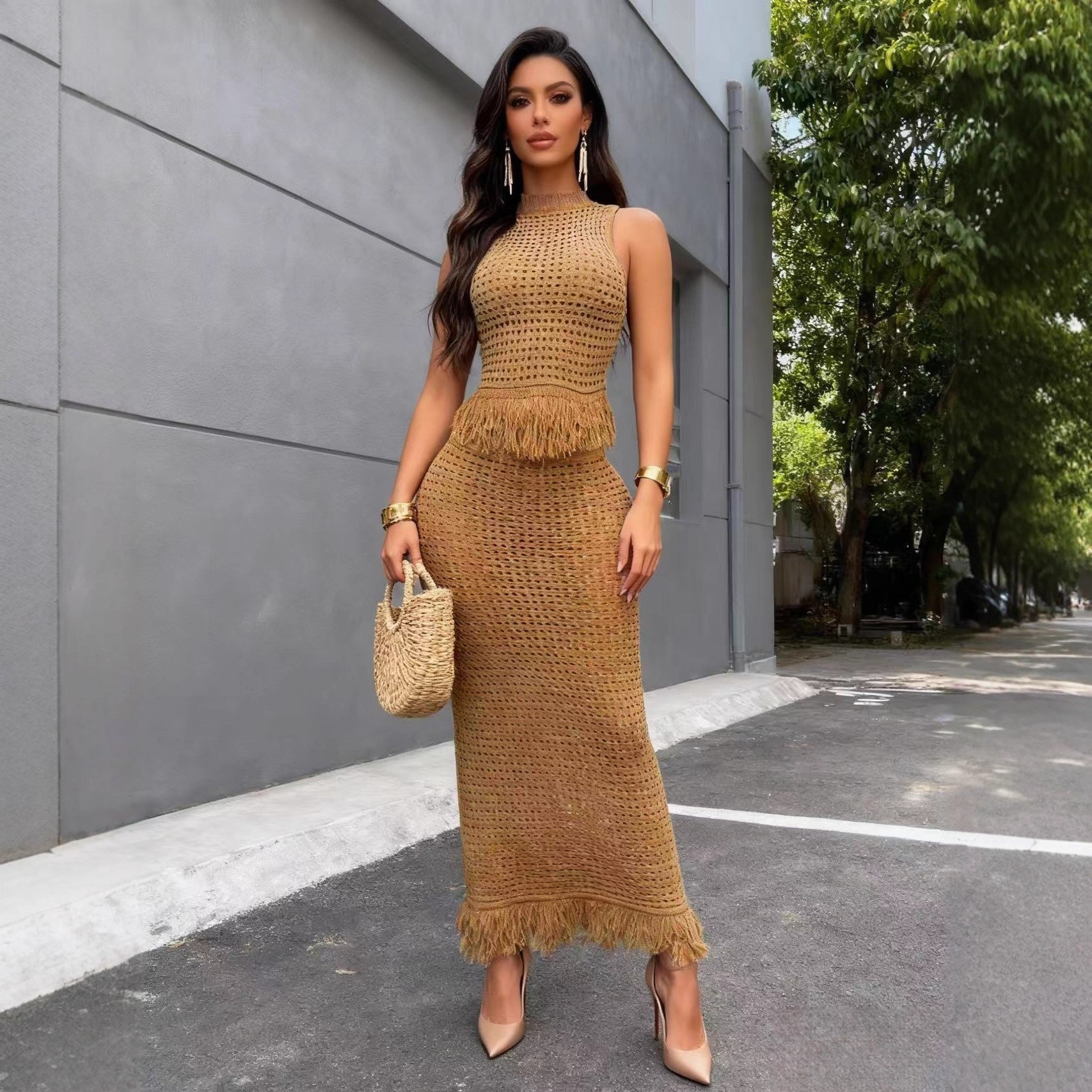 Hollow-out Fringe Sleeveless High-neck Top With Bodycon Long Skirt Two-piece SetHollow-out Fringe Sleeveless High-neck Top With Bodycon Long Skirt Two-piece Set